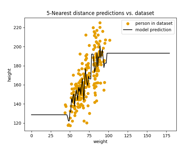 Så ved å øke antallet personer vi bruker fra datasettet vårt for hver prediksjon har vi klart å forbedre modellens prestasjon. Veldig kult! Så la oss igjen tenke litt på hva modellen vår gjør: For hver vektmåling modellen skal predikere en høyde, så lager den på en måte et nabolag av vektmålinger fra datasettet vårt. I dette nabolaget velger den de 5 nærmeste naboene og beregner gjennomsnittshøyden for disse 5 naboene. Dette blir høyden modellen predikerer for den nye vektmålingen. Vi kan generalisere denne modellen til å kunne bruke et arbitrært antall naboer for beregningen også. La oss kalle antallet naboer vi bruker $k$. Vi kan utvide koden vi har skrevet slik: