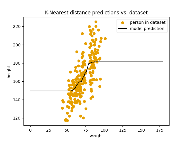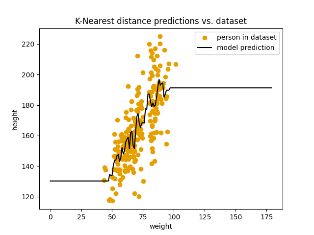 I modellen vår så langt, så ser vi kun på den nærmeste personen i datasettet vårt, men hva om vi er veldig uheldig og den nærmeste personen er unormalt lav eller unormalt høy for vekten sin. Da vil jo modellen predikere en unormalt lav eller høy verdi også. Hvis vi tar en titt på prediksjonene våre igjen, så ser vi at modellen gjøre et stort hopp mellom ca 75kg og 80kg. Her har vi nettopp et slikt tilfelle, der den nærmeste målingen vi har på litt over 75 kg er unormalt lav, mens den nærmeste målingen nært 80 kg er unormalt høy. Modellen tror med andre ord at en typisk person på 75kg er ca. 130 cm, mens om personen er bare 5 kg tyngre er den nesten 220 cm. Det kan umulig stemme. Hvordan kan vi unngå det?