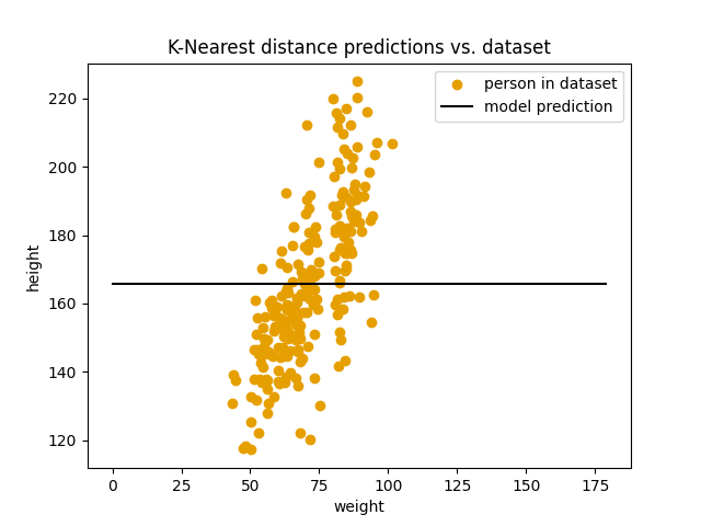 Så modellen ender til slutt opp med bare å predikere gjennomsnittshøyden i datasettet vårt for enhver vektmåling om vi setter $k$ til en for høy verdi. $k$ er altså noe vi må justere og tilpasse for å finne den beste versjonen av $k$-nærmeste nabo modellen. En annen ting vi kan justere i modellen vår er hvordan vi kombinerer naboene. I modellen vi har brukt her beregner vi gjennomsnittet av høyden til naboene våre og bruker det som prediksjon. Men det finnes mange andre måter å gjøre dette på. For eksempel, hvis vi havner i en situasjon hvor den femte naboen er mye lengre unna enn de fire andre naboene vi finner, er det kanskje urimelig å la den påvirke resultatet like mye som de andre fire. For å gjøre noe med det kunne vi for eksempel vektet bidraget til hver nabo basert på hvor langt unna den er. Dette er en av mange måter man kan utvide $k$-nærmeste nabo modellen for å tilpasse den forskjellige problemer vi møter på.