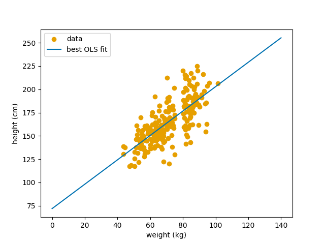 Da starter vi med å måle både vekt og høyde per person i utvalget vårt. Hver person går opp på en vekt og stiller seg inntil en vegg, slik at vi kan måle både vekt og høyde, på samme måte for alle personer. Vi skriver så ned det vi måler og dermed har vi datasettet vi ønsket oss. Men hvorfor lagde vi akkurat dette datasettet? Hvorfor brukte vi vekt for å kunne si noe om høyde? Jo, hvis du husker tilbake til [første post}(https://enklypesalt.com/posts/correlation/), så antok vi at det var en sammenheng mellom økende høyde og økende masse på en generell menneskekropp. Altså, jo høyere en person er, jo tyngre er den, på generell basis. Vi gjorde også noen enkle evalueringer av datasettet vårt for å se om det var en positiv korrelasjon mellom vekt og høyde. Det var det jo. Ettersom korrelasjon fungerer begge veier, betyr dette at økt vekt også er korrelert med økt høyde. Altså kan det kanskje være mulig å si noe om en persons høyde dersom vi kjenner vekten deres. Vi antar altså at høyde kan modelleres som en /funksjon/ av vekt, slik:
