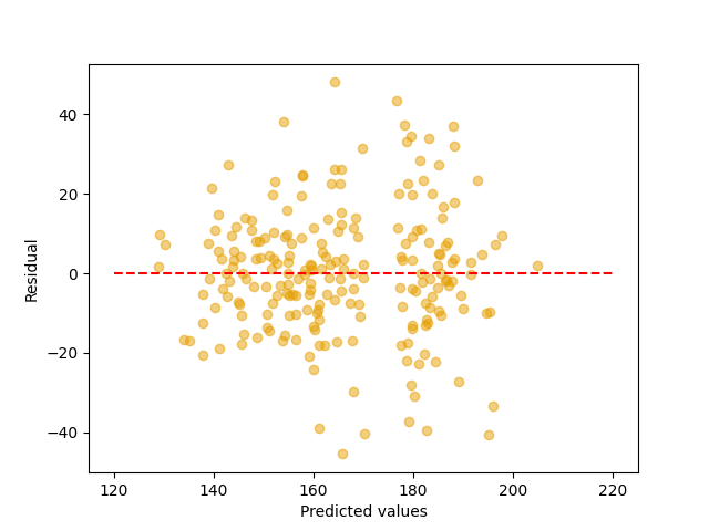 Vi plotter residualene våre med residual langs y-aksen og prediksjonsverdien langs x-aksen. Vi markerer også nullinjen med en stiplet rød linje. Det er denne vi måler i mot.